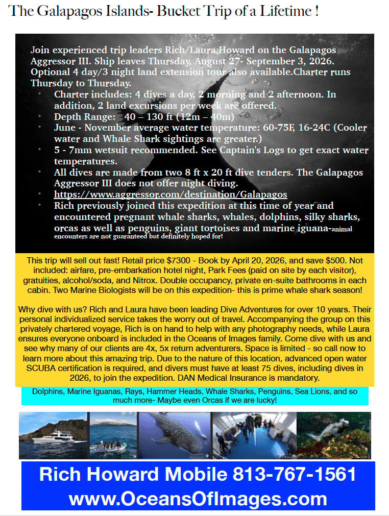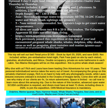 This trip offers the chance to encounter lots of sharks, whales, dolphins, sea lions, orcas and possibly, mola-mola. A day visiting the giant land tortoises is also included. List price for live aboard is $7300.00